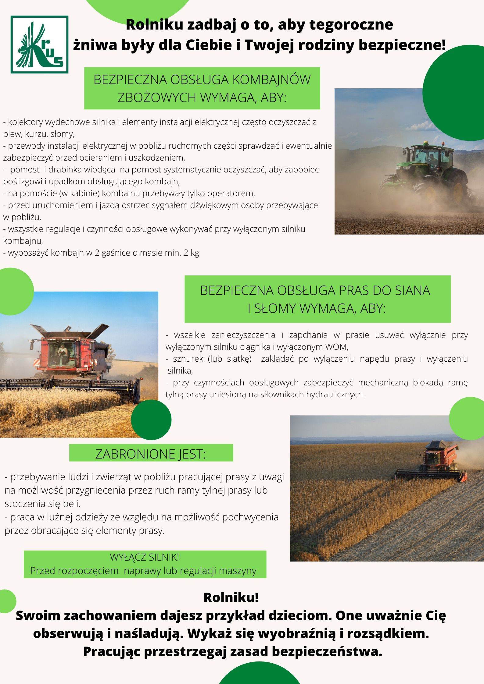 Akcja „Bezpieczne żniwa” ma na celu uświadomienie rolnikom zagrożeń występujących podczas żniw, a także przy obsłudze maszyn oraz urządzeń w gospodarstwie rolnym.