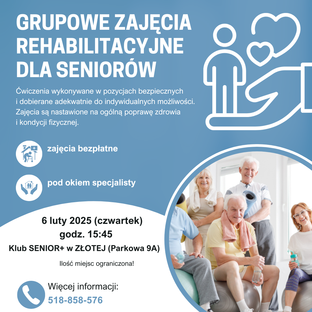 Kluby SENIOR+ w Złotej, Chrobrzu i Pełczyskach zapraszają seniorów z Gminy Złota na bezpłatne zajęcia rehabilitacyjne. Więcej szczegółów na grafikach poniżej.