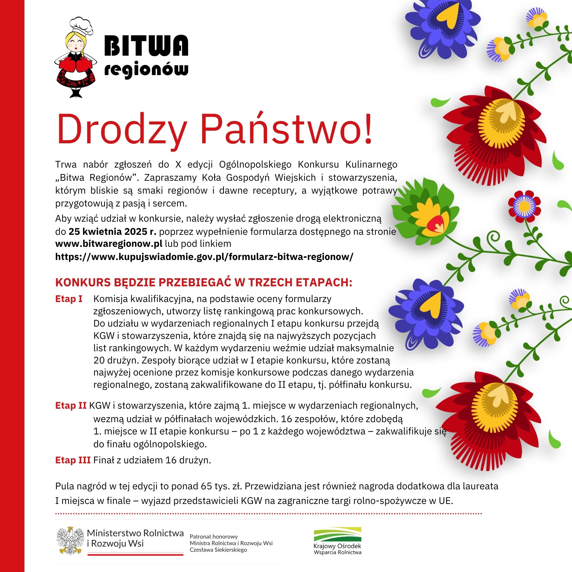W tym roku pula nagród to ponad 65 tys. zł. Przewidziana jest również nagroda dodatkowa dla laureata I miejsca w finale – wyjazd przedstawicieli KGW/stowarzyszenia na zagraniczne targi rolno-spożywcze w UE.