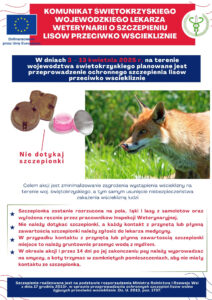 Czytaj więcejAkcja ochronnego szczepienia lisów przeciwko wściekliźnie na terenie woj. świętokrzyskiego, które przeprowadzone zostanie w dniach 3-13 kwietnia 2025 r. Ogłoszenie - wiosna 2025 Pismo przewodnie - Urzędy Miast i Gmin