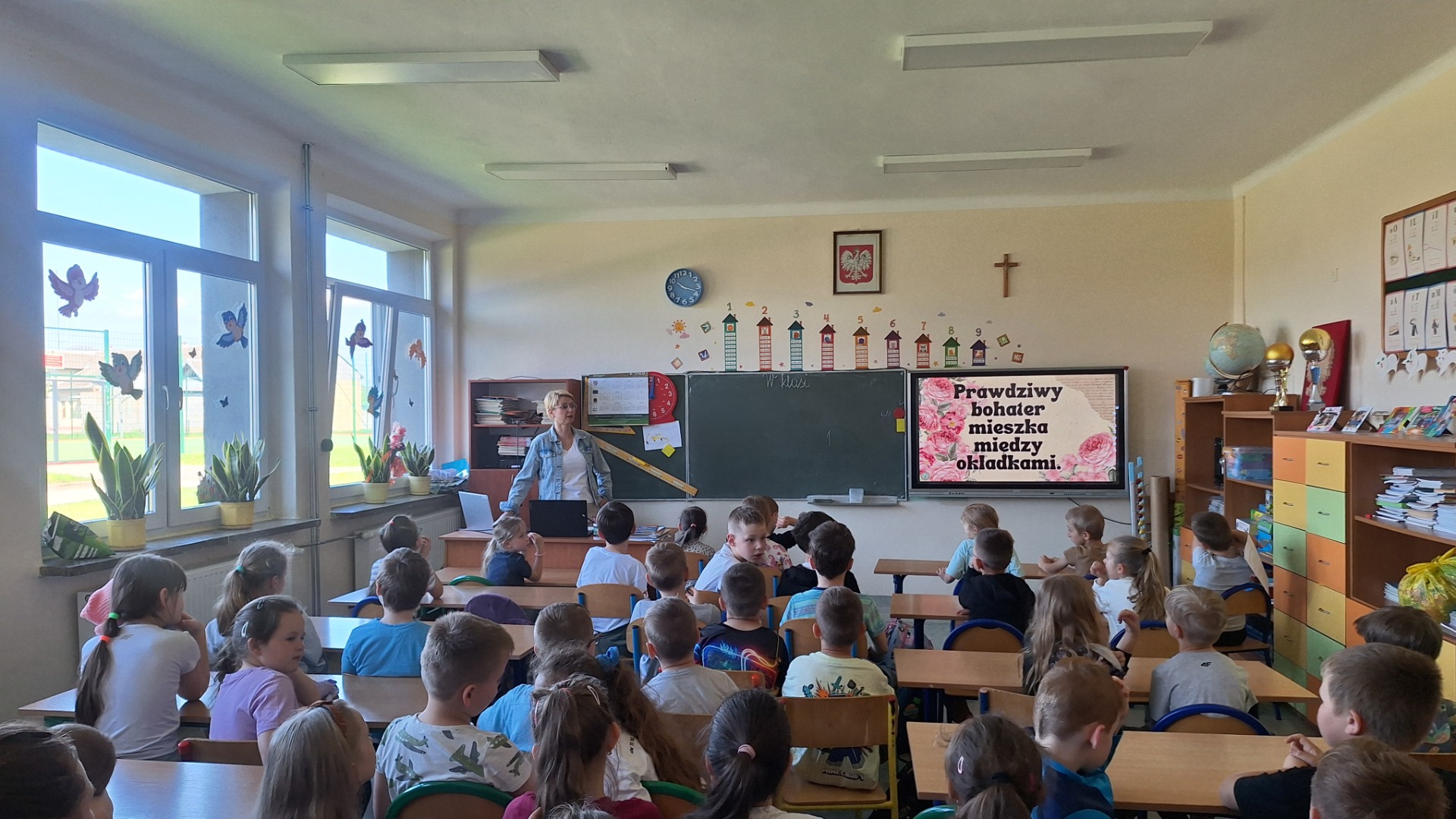 W prezentacji przedstawiłam im ciekawostki dotyczące książek, a także naukowo potwierdzone informacje np. taką, że czytanie przynajmniej 6 minut dziennie może obniżyć poziom stresu o 60% J Poza tym, dla podkreślenia roli książki w naszym życiu, przytoczyłam kilka sentencji o książkach. Wśród nich znalazły się m.in.: Czytanie to supermoc! Z książką nigdy nie jesteś sam! Książki nie potrzebują WI-FI – one działają zawsze, a także cytat Ernesta Hemingway’a: „Nie ma lojalniejszego przyjaciela niż książka.” Mam nadzieję, że wszyscy przekonają się o słuszności tezy Hemingwey’a. W tym celu zapraszam do biblioteki szkolnej, dla każdego znajdziemy książkę – przyjacielaJ
